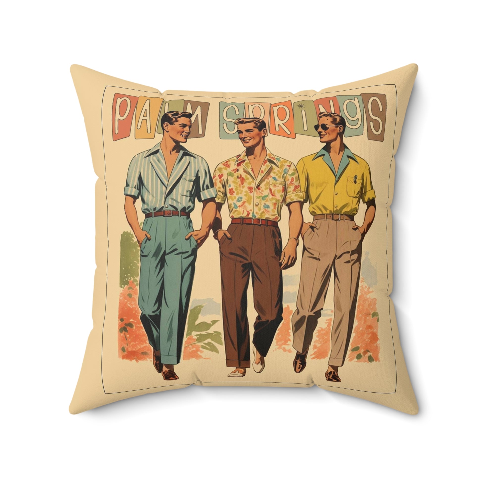 1950s illustration of three men in Palm Springs with pastel colors